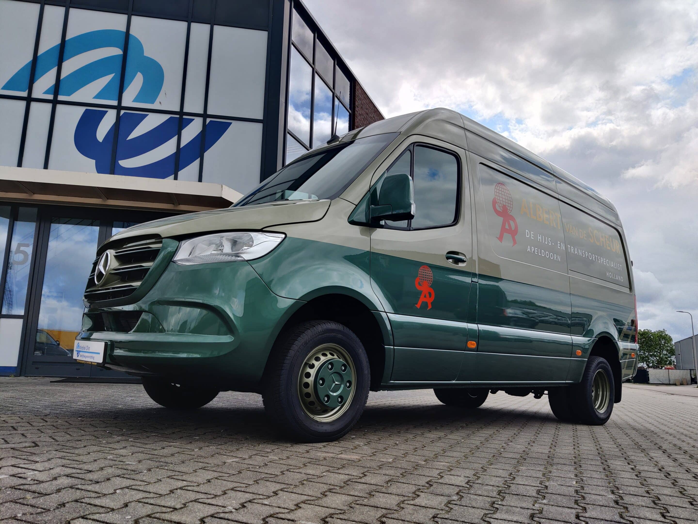 Nadat de nieuwe Mercedes Sprinter in de kenmerkende huiskleuren werd gespoten, mochten wij voor Hijs- en Transportspecialist Albert van de Scheur de finishing touch geven.