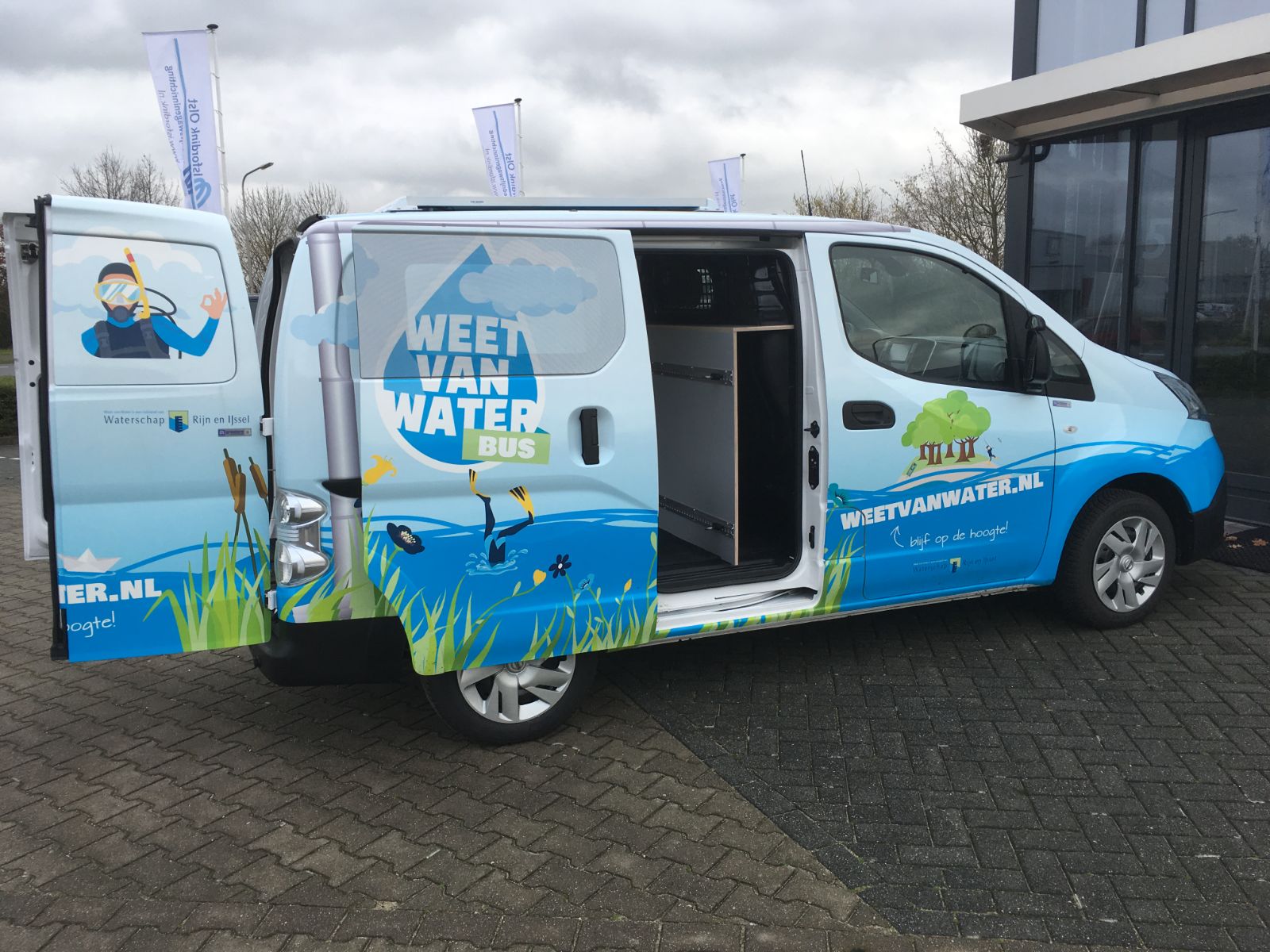 Met deze elektrische bedrijfsauto gaat het Waterschap Rijn & IJssel op toernee in het kader van ‘Weet van water’. Het doel is om mensen te vertellen over de veranderende rol van water in het leven. De Nissan e-NV200 is door ons voorzien van een zonnepaneel, LPS 12v/220v systeem en flatscreen TV.