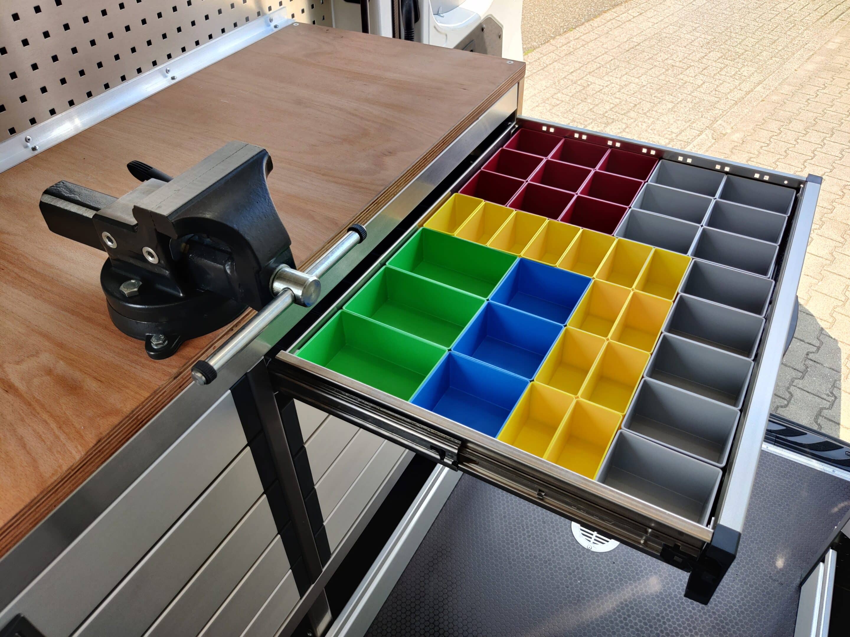 Deze Sprinter L2-H2 4WD wordt ingezet als servicewagen. Om onderweg over 230v te kunnen beschikken heeft Deutsche Windtechnik gekozen voor de Zeliox ECO 1 met 1600w omvormer. Deze vernieuwende Nederlandse techniek combineert omvormer, accu en regel- en beveiliging-elektronica in een compacte behuizing. De bedrijfswageninrichting van Aluca is lichtgewicht én robuust en kent naast vele laden en aflegvakken ook een werkbank. De combinatie van Easy-Aero dakventilatie en RVS vloerontluchter zorgt voor optimale laadruimte-ventilatie. Met Whelen LED-interieurverlichting kan bovendien in donkere omstandigheden veilig worden gewerkt.