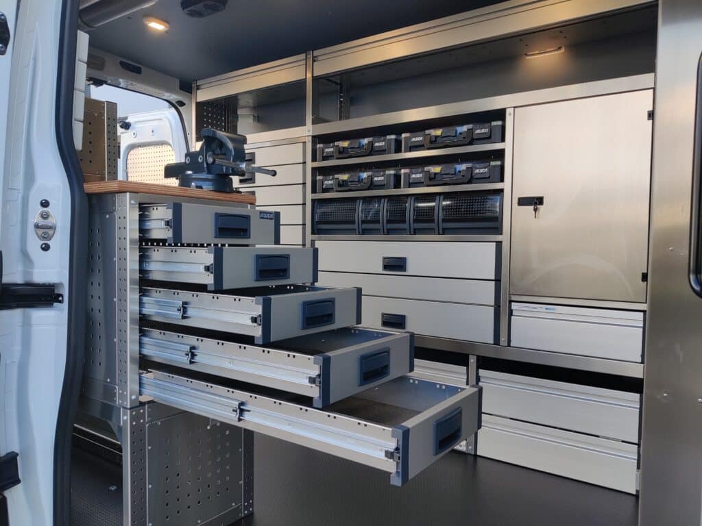 Inrichting én laadkraan in Ford Transits van Rouwmaat