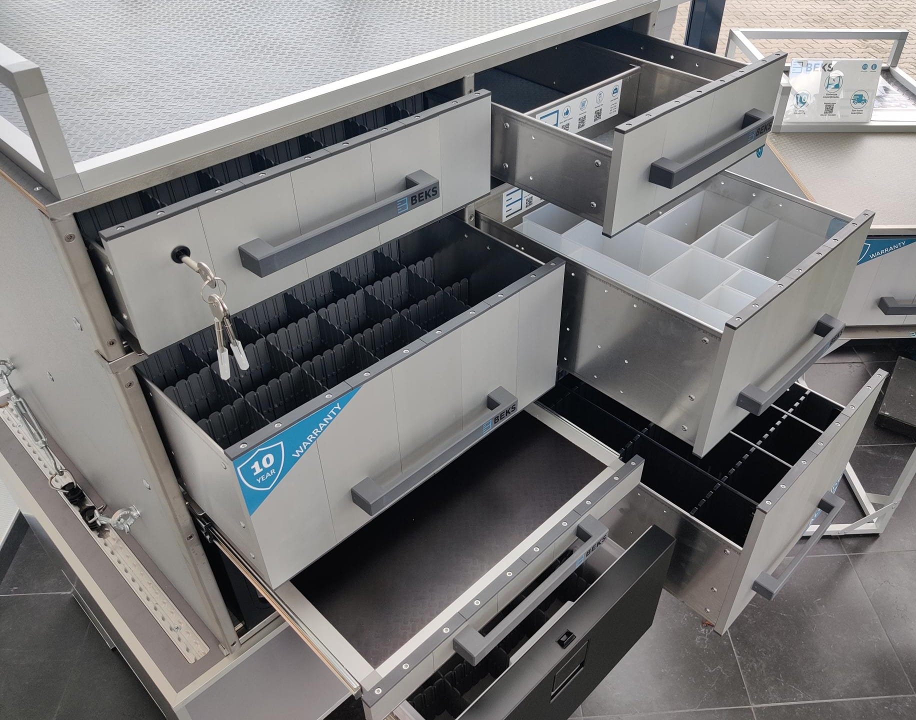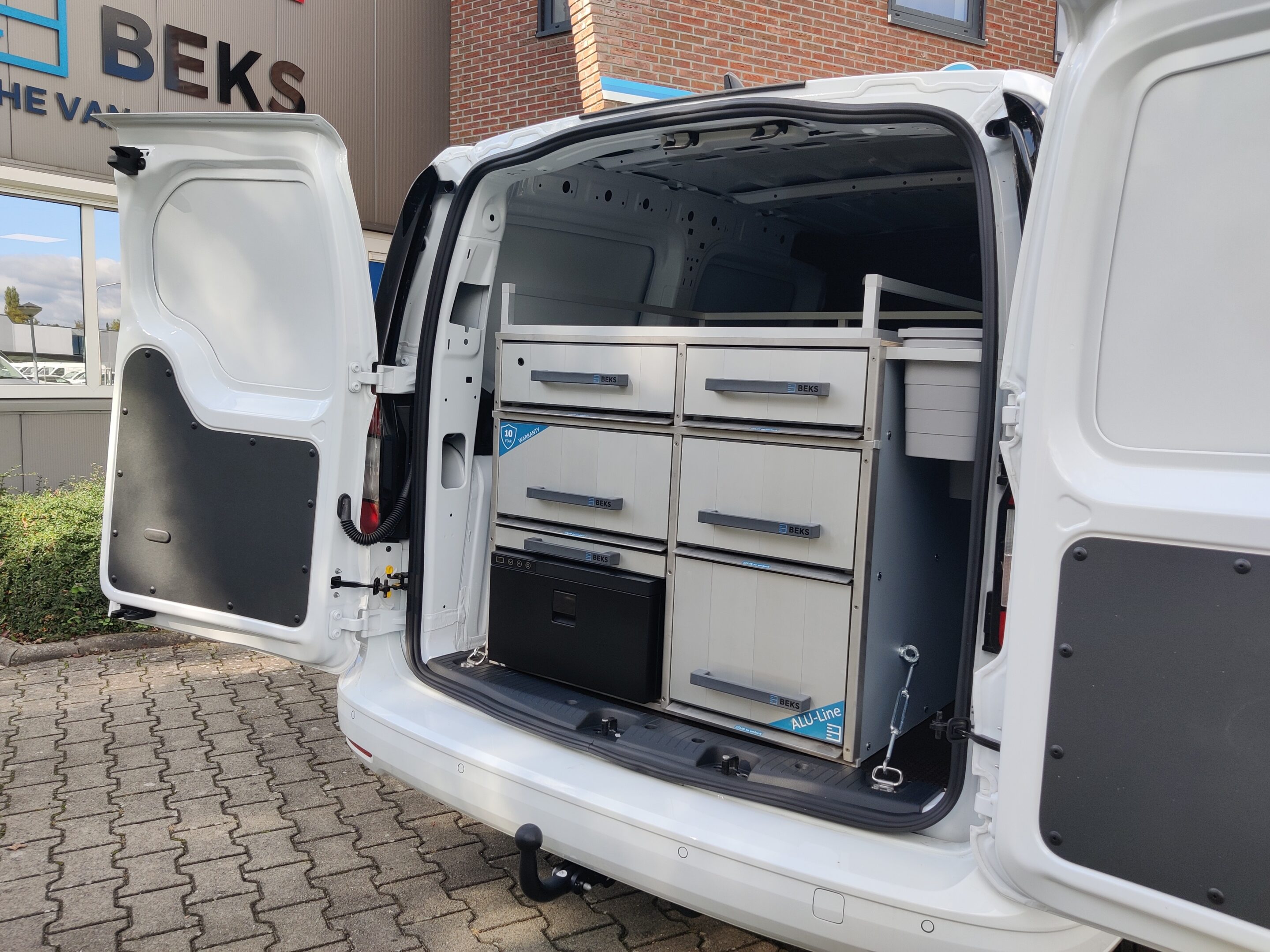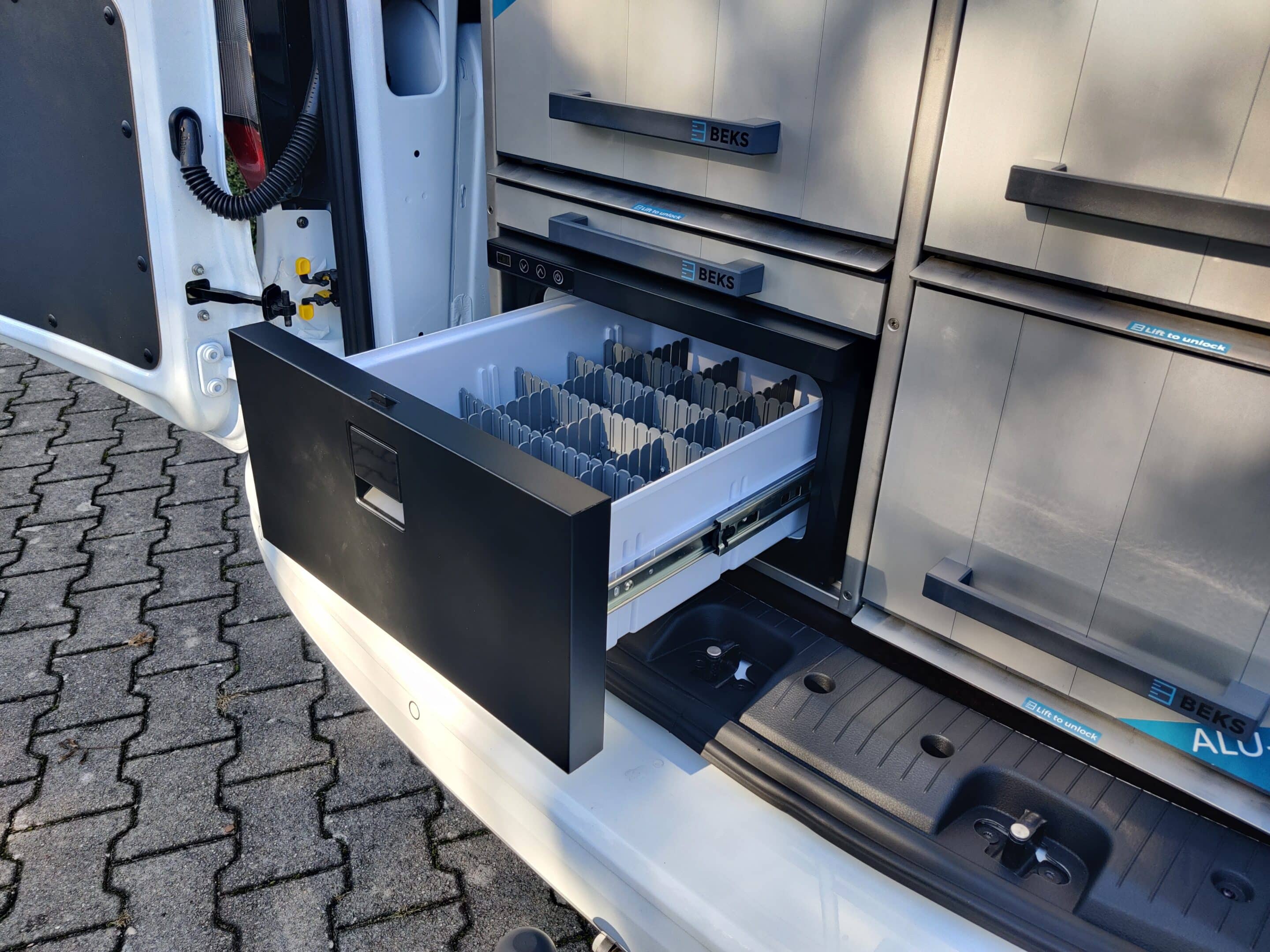 Het lichtgewicht ladesysteem van BEKS for Vets maakt je auto een hygiënisch, representatief, en functioneel verlengstuk van de praktijk. Binnen het systeem kun je eindeloos combineren. De duurzame en lichtgewicht materialen als aluminium, kunststof en populieren houtsoort met gladde afwerking leveren een strak ogend design op. Het BEKS for Vets systeem is gemakkelijk te demonteren waarmee jouw voertuig ook voor andere doeleinden gebruikt kan blijven worden, en met de kwaliteit welke wordt vertaald naar het 10 jarig garantieplan kan het systeem met gemak mee naar een volgend voertuig.